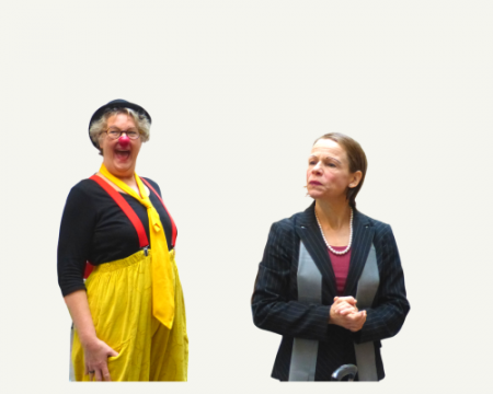 Mit diesen Fragen pirschten wir Spielerinnen (wir Clowns4Change) uns an das Thema heran und erkundeten mögliche Szenenvarianten. Wir redeten, improvisierten, konkretisierten, veränderten, verfeinerten. Dann stand die Szene. Dr. Beatrice Baecker und Margooo waren bereit für die Bühne – wir fuhren zum KlimaClever-Tag nach Gifhorn.